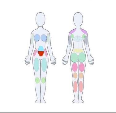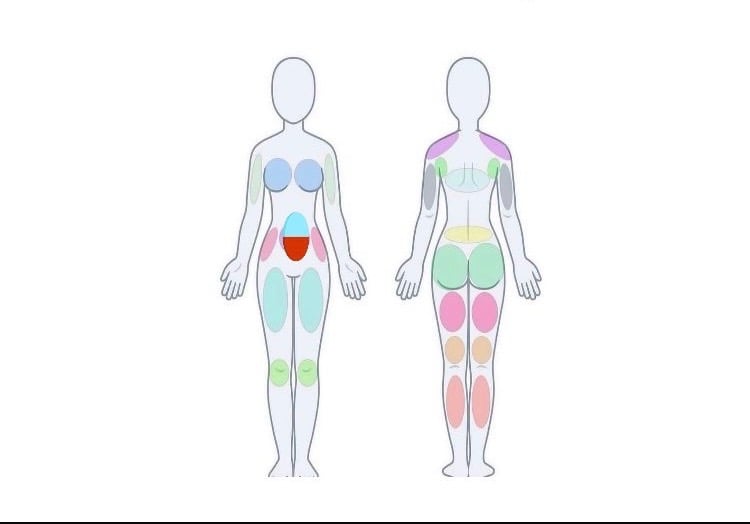 LIST OF AREAS: BOTH SHOULDERS, BOTH UPPER ARMS, BOTH HIPS, LOWER STOMACH, UPPER STOMACH, BOTH BREAST, BUTTOCKS, BACK UPPER LEGS, BACK OR FRONT LEGS, FRONT KNEES, BACK OF THE KNEES, INNER TIGHS, LOWER BACK, MIDDLE BACK, UPPER BACK…